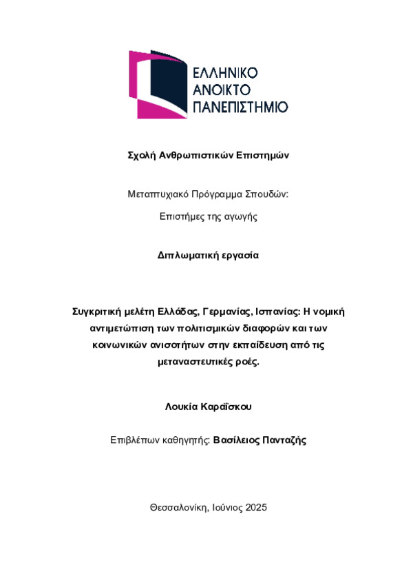 This thesis offers a comparative analysis of how Greece, Germany, and Spain address cultural diversity and social inequality in education in response to migration flows. It examines the legal frameworks and educational policies that shape each country’s approach to integrating students with migrant or refugee backgrounds, within the broader context of increasing multiculturalism and integration challenges across the European Union.