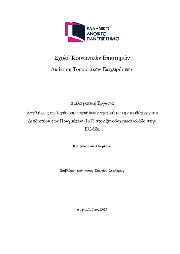 Η παρούσα εργασία εξετάζει το φαινόμενο της υιοθέτησης του Διαδικτύου των Πραγμάτων (Internet of Things-IoT) στον ξενοδοχειακό κλάδο στην Ελλάδα εστιάζοντας στις αντιλήψεις στελεχών και υπευθύνων τμημάτων. Η μελέτη του θέματος κρίνεται ιδιαίτερα σημαντική, καθώς ο τουριστικός τομέας αποτελεί έναν από τους βασικούς πυλώνες της ελληνικής οικονομίας και οι ξενοδοχειακές επιχειρήσεις βρίσκονται σε διαρκή αναζήτηση τρόπων ενίσχυσης της ανταγωνιστικότητάς τους.