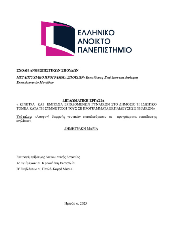 This thesis was carried out with the aim of investigating the motivations, as well as the obstacles faced by women working in the public and the private sectors, to participate in an adult education program (training, postgraduate, etc.). More specifically, 200 women (100 women working in the private sector and 100 women working in the public sector) answered questions through the quantitative method (questionnaire) regarding the motivations and obstacles they face within their workplace and their social enviroment. The questionnaire also investigated demographic data of the women who participated in it, such as their age, their marital status, the number of children, their educational level, etc. The survey was conducted from March to April 2025. In addition, four interviews were conducted with women working in the private and public sectors, both married and single, in order to more fully document through qualitative research the results of the quantitative research, which was conducted through questionnaires.
