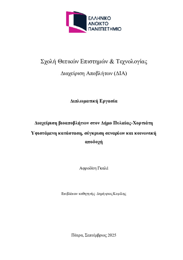 - Διαχείριση βιοαποβλήτων στον Δήμο Πυλαίας-Χορτιάτη Υφιστάμενη κατάσταση, σύγκριση σεναρίων και κοινωνική αποδοχή