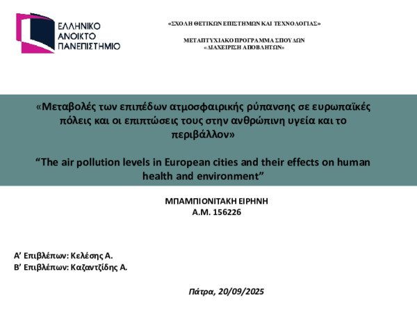- «Μεταβολές των επιπέδων ατμοσφαιρικής ρύπανσης σε ευρωπαϊκές πόλεις και οι επιπτώσεις τους στην ανθρώπινη υγεία και το περιβάλλον»
