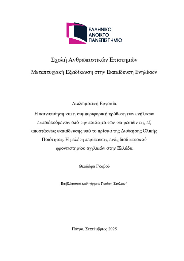 - Ικανοποίηση εκπαιδευομένων | Συμπεριφορική πρόθεση | Διοίκηση Ολικής Ποιότητας (ΔΟΠ) | Εξ αποστάσεως μάθηση | Αντιλαμβανόμενη ποιότητα υπηρεσιών | Θεωρία επιβεβαίωσης προσδοκιών (ECM) | Θεωρία σχεδιασμένης συμπεριφοράς (TPB)