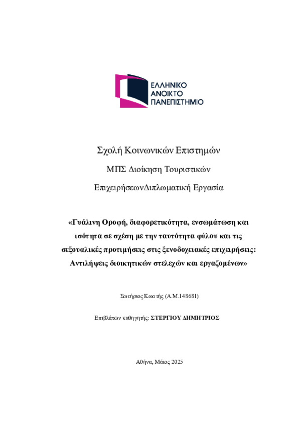 Η παρούσα διπλωματική εργασία εξετάζει το φαινόμενο της γυάλινης οροφής και τις έμφυλες ανισότητες στον ξενοδοχειακό κλάδο, εστιάζοντας στις πολιτικές Διαφορετικότητας, Ισότητας και Συμπερίληψης (DEI) σε σχέση με την ταυτότητα φύλου και τον σεξουαλικό προσανατολισμό. Μέσα από ποσοτική έρευνα σε εργαζόμενους και διοικητικά στελέχη ξενοδοχείων 5 αστέρων στην Αττική και τις Κυκλάδες, αναλύονται οι αντιλήψεις γύρω από τις διακρίσεις, η υφιστάμενη οργανωσιακή πραγματικότητα και οι βαθμοί εφαρμογής πολιτικών DEI. Η εργασία προτείνει ένα δυναμικό μοντέλο οργανωσιακής αλλαγής, βασισμένο στις φάσεις της αναγνώρισης των ανισοτήτων (Unfreeze), της εφαρμογής παρεμβάσεων (Change) και της παγίωσης της ισότητας (Refreeze), αναδεικνύοντας τις επιπτώσεις σε επίπεδο εργαζομένων, ομάδων και οργανισμών. Η μελέτη στοχεύει στην ανάδειξη πρακτικών που μπορούν να οδηγήσουν σε ένα πιο δίκαιο και συμπεριληπτικό ξενοδοχειακό περιβάλλον.