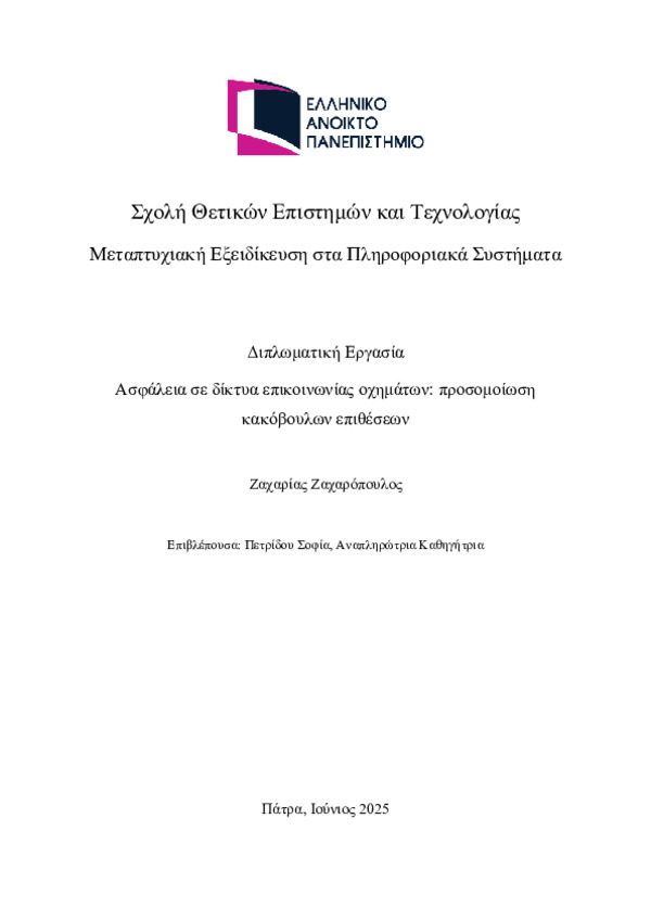 Η ασφάλεια αποτελεί κρίσιμο παράγοντα για την ανάπτυξη των δικτύων επικοινωνίας οχημάτων και αυτο-οδηγούμενων οχημάτων. Τα ευφυή συστήματα μεταφορών συμπεριλαμβανομένων των συνδεδεμένων και αυτόνομων οχημάτων υιοθετούνται όλο και περισσότερο για τη δημιουργία βιώσιμων έξυπνων περιβαλλόντων. Το αυξανόμενο ενδιαφέρον δημιουργεί με τη σειρά του απαιτήσεις για ασφαλή επικοινωνία σε όλο το οικοσύστημα Vehicle-to-Everything (V2X) - συμπεριλαμβανομένων των αλληλεπιδράσεων όχημα με όχημα (V2V) και όχημα με υποδομή (V2I). Σκοπός αυτής της διπλωματικής εργασίας είναι η μελέτη ζητημάτων ασφάλειας σε περιβάλλοντα επικοινωνίας V2X μέσω της προσομοίωσης κακόβουλων επιθέσεων, της επίδρασής τους στο δίκτυο και της διερεύνησης κατάλληλων αντίμετρων. Οι επιμέρους στόχοι της εργασίας είναι η ανάλυση των απαιτήσεων ασφαλείας και διαφόρων τύπων επιθέσεων σε κανάλια επικοινωνίας όπως V2V και/ή V2I, ο προσδιορισμός διαφορετικών τύπων επιθέσεων όπως επίθεση άρνησης υπηρεσίας (denial-of-service attack), η ανάπτυξη ενός πλαισίου προσομοίωσης ρεαλιστικών σεναρίων επιθέσεων σε όλο το οικοσύστημα V2X και η αξιολόγηση των επιπτώσεων των επιθέσεων στην απόδοση του δικτύου όπως θα προκύψουν μέσα από τα κατάλληλα ορισμένα σενάρια προσομοίωσης.