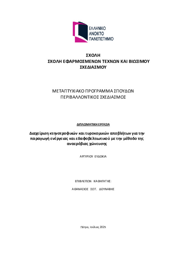 Διαχείριση κτηνοτροφικών και τυροκομικών αποβλήτων για την παραγωγή ενέργειας και κομπόστ με την μέθοδο της αναερόβιας χώνευσης - Identifier: 227807