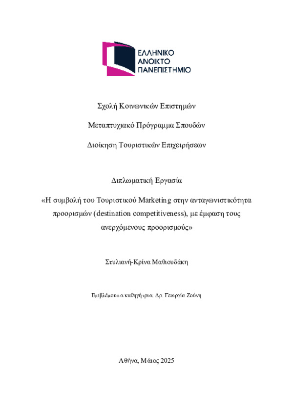 - Η συμβολή του Τουριστικού Marketing στην ανταγωνιστικότητα προορισμών, με έμφαση τους ανερχόμενους προορισμούς