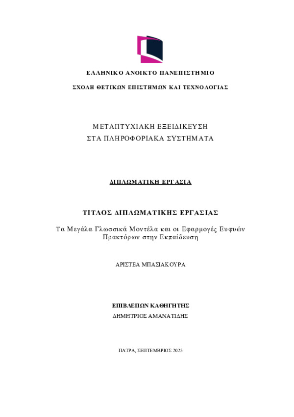 - Μεγάλα Γλωσσικά Μοντέλα | Ευφυείς Πράκτορες | Εκπαίδευση | Τεχνητή Νοημοσύνη | Εξατομικευμένη Μάθηση | Αυτόματη Αξιολόγηση | Ηθικά Ζητήματα | Large Language Models | Intelligent Agents | Education | Artificial Intelligence | Personalized Learning | Automated Assessment | Ethical Issues