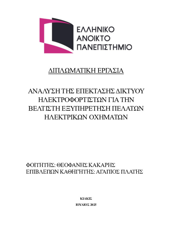 Αναλύονται τρία διαφορετικά διεθνώς αναγνωρισμένα μαθηματικά μοντέλα για τον υπολογισμό του απαιτούμενου αριθμού φορτιστών, με βάση ενεργειακά, τεχνικά και στατιστικά δεδομένα. Επιπλέον, παρουσιάζεται μια πολυκριτηριακή μεθοδολογία χωροθέτησης δημοσίως προσβάσιμων φορτιστών, μέσω του υπολογισμού του Δείκτη καταλληλότητας, ο οποίος ενσωματώνει χωρικά, κοινωνικά και λειτουργικά κριτήρια.