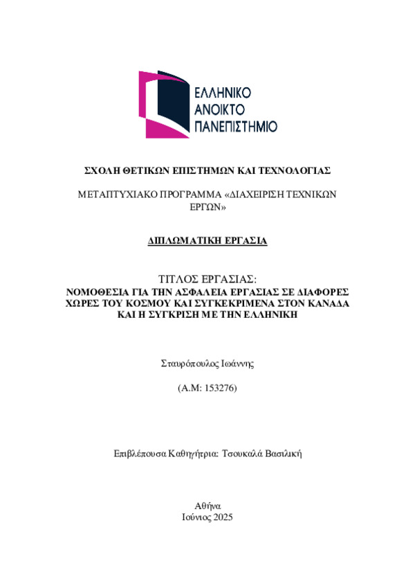 Legislation on occupational safety in various countries around the world, specifically in Canada, and comparison with Greek legislation (Αγγλική)