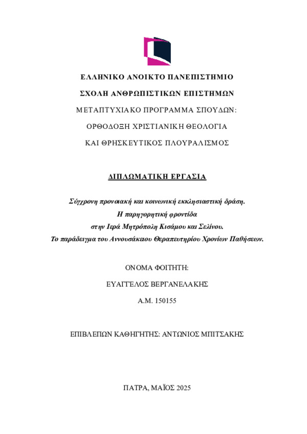 Περιγραφή: ΒΕΡΓΑΝΕΛΑΚΗΣ ΕΥΑΓΓΕΛΟΣ Σύγχρονη προνοιακή και κοινωνική εκκλησιαστική δράση - Η παρηγορητική φροντίδα στην Ι.Μ.Κ.Σ. - Το παράδειγμα του Αννουσάκειου Θεραπευτηρίου Χρονίων Παθήσεων.pdf (pdf) Book Reader