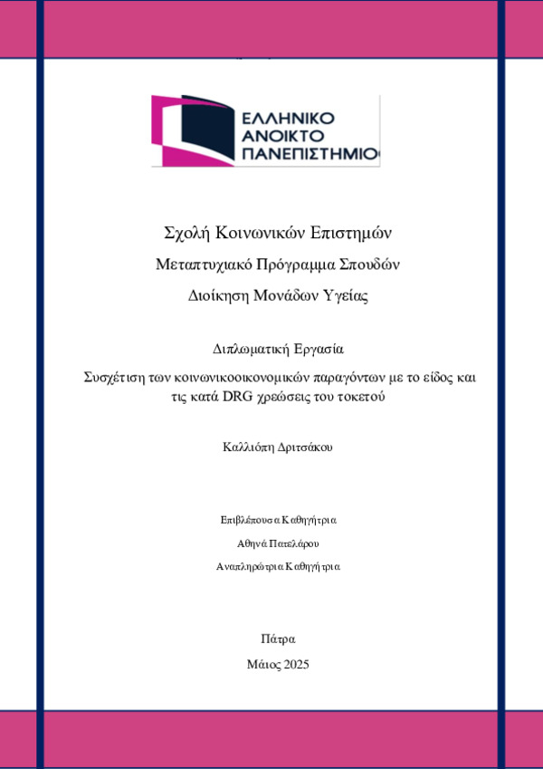 Διπλωματική Εργασία Συσχέτιση των κοινωνικοοικονομικών παραγόντων με το είδος και τις κατά DRG χρεώσεις του τοκετού Περιγραφή: ΔΡΙΤΣΑΚΟΥ ΚΑΛΛΙΟΠΗ_ΔΙΠΛΩΜΑΤΙΚΗ ΕΡΓΑΣΙΑ _.pdf (pdf)