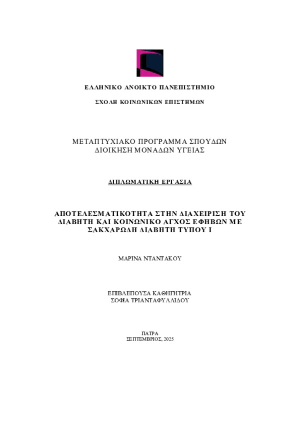 Diabetes mellitus is a chronic disease that occurs frequently in children and adolescents. The effects affect not only the physical but also the emotional and social well-being of adolescents. Teenagers with Type 1 diabetes face obstacles in effectively managing the disease. This master thesis presents a study aimed at exploring the views of adolescents with Type 1 diabetes regarding their effectiveness in disease management and the social anxiety it may cause. A quantitative research method was selected for the study. The research sample consisted of 124 adolescents diagnosed with Type 1 diabetes. A closed-ended questionnaire was developed for data collection. The findings revealed that patients with Type 1 diabetes rate their health status as moderate and do not report a high level of self-efficacy. This is influenced by the obstacles they face, such as lack of knowledge, changes in diet and lifestyle, and the emergence of negative emotions. Furthermore, it was observed that the adolescents do not experience high levels of social anxiety, and no significant differences were found between their demographic characteristics and the way they manage the disease (p > 0.05). Finally, the study found a correlation between the obstacles adolescents face and their self-management of diabetes (r(122) = 0.601, p < 0.001), as well as between social anxiety and diabetes self-management (r(122) = 0.227, p = 0.011).