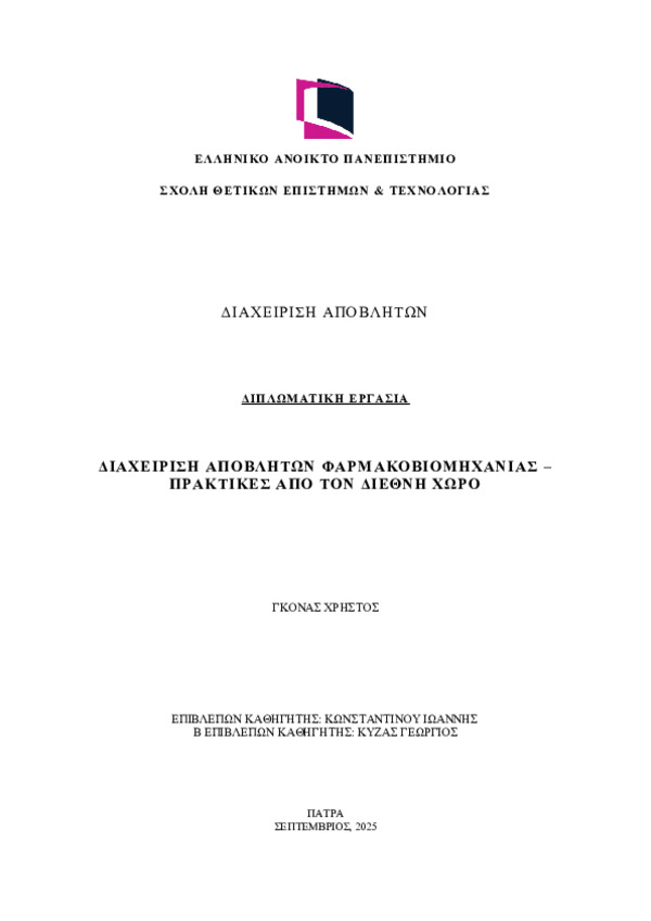 In recent years, there has been growing a global concern about pollutants from pharmaceutical products. Waste from pharmaceuticals, which can be either solid or liquid, is often detected in aquatic environments and ecosystems, and is also characterized by complexity and increased toxicity. The goal of the pharmaceutical industry is to reduce the quantities of waste produced by improving production processes and also from recovery, reuse, and recycling methods. Additionally, the pharmaceutical industry emphasizes on the treatment of waste water to remove suspended solids, odor, BOD, COD and hazardous and toxic substances. Wastes treatment, particularly liquid waste, can be achieved through biological treatment processes (such as activated sludge, MBR reactors, UASB reactors, etc.), physicochemical processes (such as adsorption, membrane technology, etc.), advanced oxidation processes (such as Fenton oxidation, ozonation, electrochemical oxidation, etc.), and also through hybrid technologies Hybrid technologies is the combination of some of the above processes. Finally in recent years, a number of major pharmaceutical companies worldwide such as Pfizer, Abbott, Abbvie etc. have shown great interest in waste reduction, treatment and removal, setting long-term targets for their waste management.