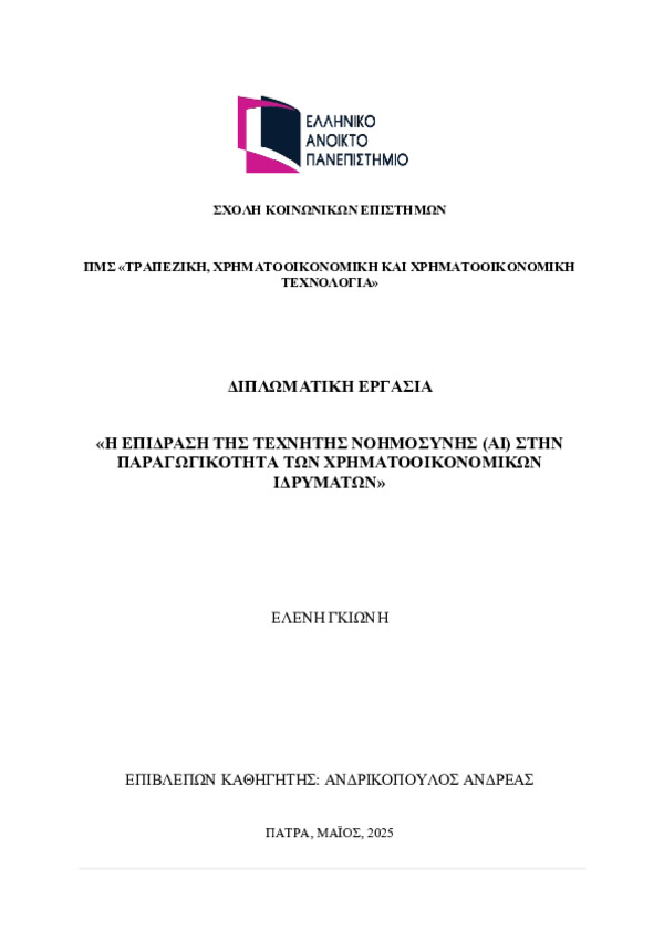 In recent years, artificial intelligence (AI) has been established and integrated into most aspects of society and business. This integration has begun to significantly impact the financial sector, offering new opportunities to enhance the productivity and efficiency of financial institutions. This Master’s Thesis examines the impact of AI on the productivity of financial organizations, focusing on areas such as data analysis, process automation, and decision-making. The application of AI algorithms enables faster and more accurate analysis of large data volumes, improves risk management processes, optimizes investment strategies, and enhances customer experiences through personalized and automated services. Furthermore, the study investigates the benefits of AI in reducing human error, cost savings, and better resource management. At the same time, it examines the challenges arising from AI usage, such as ethical issues, data protection, and security, as well as its implications for employment in the sector. With the ongoing evolution of technology, its integration into the financial sector is expected to have a decisive impact on shaping the future of financial services.