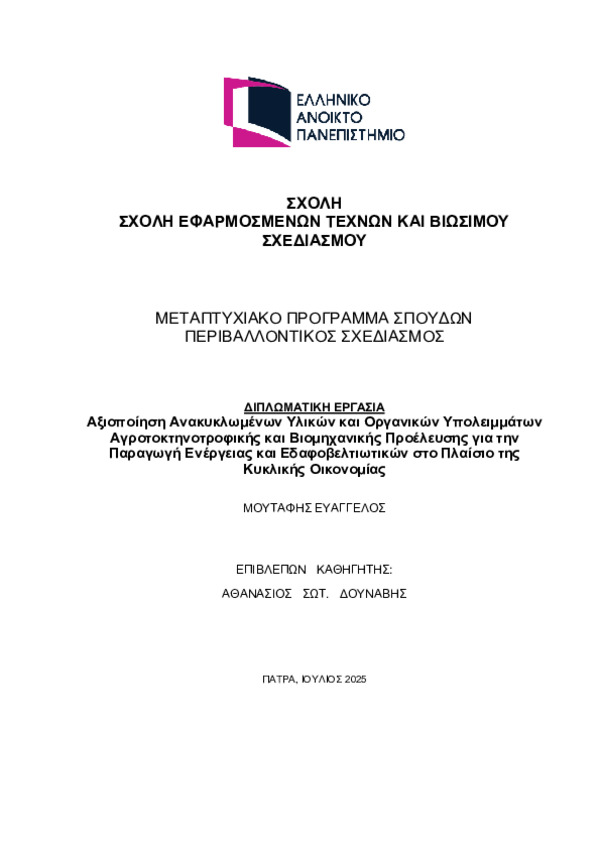 The thesis with title "Valorization of Recycled Materials and Organic Residues from Agriculture, Livestock Farming, and Industry for Energy Production and Soil Improvement in the Context of the Circular Economy," was prepared as part of the Master's Program entitled "Environmental Design of Infrastructure Projects" at the Hellenic Open University.