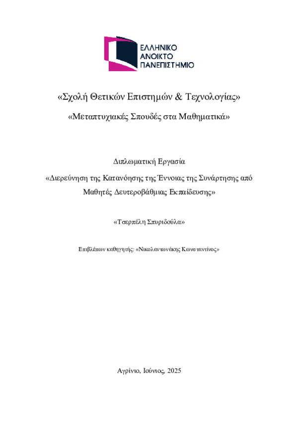 thesis_Τσερπέλη Σπυριδούλα_Διερεύνηση της Κατανόησης της Έννοιας της Συνάρτησης από Μαθητές Δευτεροβάθμιας Εκπαίδευσης Περιγραφή: thesis_Tserpeli_Spyrid..pdf (pdf)