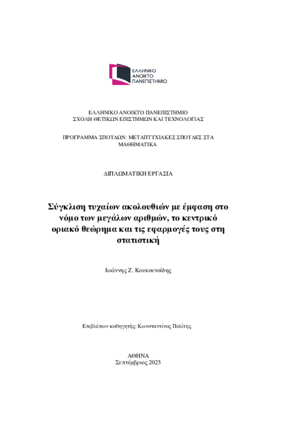 - Σύγκλιση τυχαίων ακολουθιών με έμφαση στο νόμο των μεγάλων αριθμών, το κεντρικό οριακό θεώρημα και τις εφαρμογές τους στη στατιστική