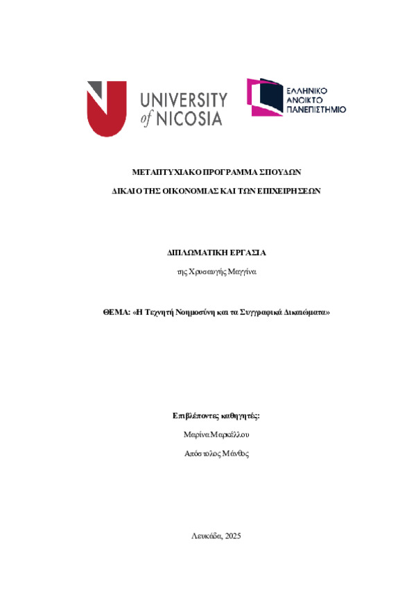 - Τεχνητή Νοημοσύνη Πνευματική Ιδιοκτησία Συγγραφικά Δικαιώματα Νομικό Πλαίσιο Αυτοματοπαραγόμενα Έργα