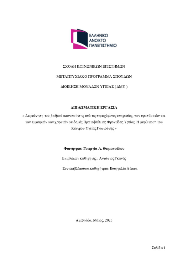 Introduction: Patient satisfaction is an essential element of the quality of health services, although these are two conceptually different terms. A multitude of studies in the international bibliography of recent years focus on measuring user satisfaction in the field of Primary Health Care. The identification of factors that influence overall user satisfaction (waiting times, user expectations, perceived quality, etc.) and the recording of consumer experiences (patients and companions) will help in measuring satisfaction and evaluating health services. The mapping of the satisfaction-quality relationship and the interaction between them may highlight possible problems regarding the organization and operation of the Gastouni Health Center. The opinion of society, although subjective, can provide, in combination with the presentation of other indicators and data, a more objective approach to the issue, enabling the development of guidelines for the optimal efficiency and effectiveness of Primary Health Care centers. Purpose: The purpose of this thesis is to investigate the degree of satisfaction of patients/users with health services provided in Primary Health Care structures and specifically in the area of responsibility of the Gastouni Health Center with the ultimate goal of contributing to the improvement of quality through a possible feedback in the process of serving the population. Methodology: Individual semi-structured interviews were conducted with eighteen (18) adult individuals who used the services of the Gastouni Health Center, either as patients or as companions of patients. The researcher performed a thematic analysis on axes and relied on the qualitative approach to evaluate the findings. Results: Through the thematic analysis, three main axes emerged: 1) Users' expectations for staffing, infrastructure and equipment improvements, 2) their experiences, positive and negative, in relation to the quality of services provided and 3) their level of satisfaction, which is influenced by the comparison between expectations and actual experience. Conclusions: The connection of the findings with the literature highlighted the importance of human communication, accessibility and continuity of care. The results demonstrate the need for targeted interventions, both at the administrative and political levels, so that Primary Health Care can effectively respond to the needs of the population.