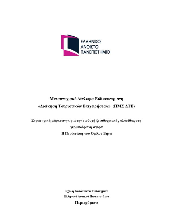 Η εν λόγω εργασία εμπίπτει στο πεδίο του στρατηγικού μάρκετινγκ, με case study το πεδίο μιας ξενοδοχειακής αλυσίδας με ποικίλες κατηγορίες ξενοδοχείων (Resort, city Hotels) σε διαφορετικές χώρες και στόχο τη γερμανόφωνη αγορά.