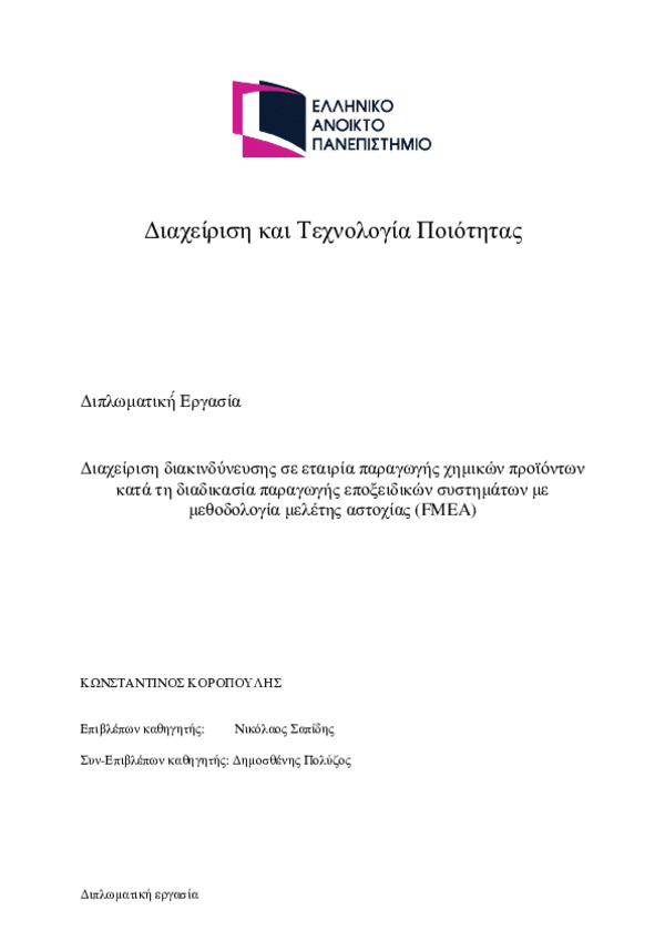 - Διαχείριση διακινδύνευσης σε εταιρία παραγωγής χημικών προϊόντων κατά τη διαδικασία παραγωγής εποξειδικών συστημάτων με μεθοδολογία μελέτης αστοχίας (FMEA)