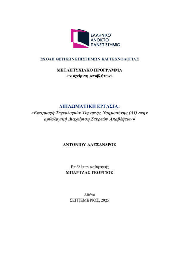 - Εφαρμογή Τεχνολογιών Τεχνητής Νοημοσύνης (ΑΙ) στην ορθολογική Διαχείριση Στερεών Αποβλήτων