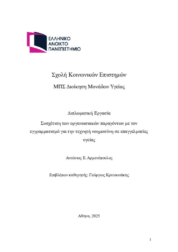 Εισαγωγή: Η ανάπτυξη της τεχνητής νοημοσύνης (ΤΝ) στον χώρο της υγείας δημιουργεί νέες δυνατότητες αλλά και προκλήσεις για τους επαγγελματίες υγείας. Ο εγγραμματισμός στην ΤΝ (AI literacy) ίσως αποτελεί σημαντικό παράγοντα για την αποτελεσματική αξιοποίηση των τεχνολογιών αυτών. Ωστόσο, δεν γνωρίζουμε πως οι οργανωσιακοί παράγοντες, όπως η υποστήριξη από τον προϊστάμενο, το μαθησιακό κλίμα, και οι εργασιακές απαιτήσεις επηρεάζουν την ανάπτυξη σχετικών γνώσεων και δεξιοτήτων.