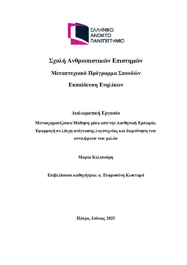 Κύριο μέρος της Διπλωματικής Περιγραφή: Μετασχηματίζουσα Μάθηση μέσα από την Αισθητική Εμπειρία. Εφαρμογή σε λέσχη ανάγνωσης λογοτεχνίας και διερεύνηση των αντιλήψεων των μελών.pdf (pdf)