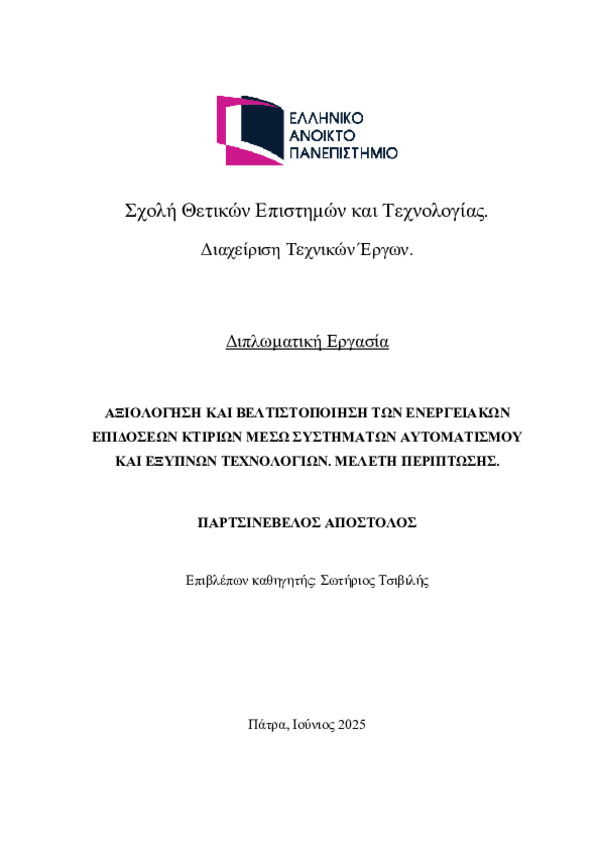 This dissertation examines the building’s energy performance optimization through the implementation of smart technologies and automations. The perpetually increasing energy consumption, in the area of buildings infrastructure, is most probably the main and broadly recognized, paramount challenge of modern era; both from the financial and environmental aspects. The initiation of automation systems in buildings, such as the Energy Management System (EMS) and the Buildings Energy Monitoring System (BEMS) enables monitoring and adjustment of energy in real time, facilitates the reduction of consumption and achieves the optimization of energy resources, attaining in the process the desired energy efficiency. This dissertation includes analysis of power consumption, automations implementation and evaluation of energy reduction. Data were collected from measurements which were processed with the IPMVP protocol (International Performance Measurement and Verification Protocol), thus achieving sound calculation of impact as a result of intervention. The results illustrated that the implementation of smart technologies could achieve energy savings up to 16.11% curtailing in the process operational cost and CO2 emissions. Furthermore, an intervention scenarios economic analysis was initiated taking into account all the business parameters such as the installation cost, depreciation period and total financial gain. The results demonstrated that the automation investments yield a viable profit, with a reasonable period of financial return that fluctuates within reasonable levels and within the limits of sound performance of machinery and equipment. Conclusively, this dissertation exemplifies the significance of smart technologies to the buildings energy management and demonstrates that their practical solution improves performance, contributing to a viable growth and reduction of energy waist.