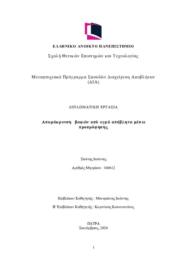 Η ραγδαία αύξηση της βιομηχανικής δραστηριότητας τα τελευταία χρόνια έχει οδηγήσει στην μεγάλη αύξηση του όγκου υγρών αποβλήτων που καταλήγουν στο περιβάλλον. Μία από τις κατηγορίες τοξικών ουσιών που υπάρχουν στα υγρά απόβλητα είναι οι βαφές (dyes) που μπορούν να έχουν αρνητικές συνέπειες τόσο στην ανθρώπινη υγεία όσο και στο περιβάλλον και τα υδάτινα οικοσυστήματα. Για την αντιμετώπιση τους έχουν μελετηθεί διάφορες μέθοδοι επεξεργασίας αποβλήτων όπως οι φυσικές, οι βιολογικές και οι χημικές. Μεταξύ αυτών, η προσρόφηση έχει κεντρίσει αρκετά το ενδιαφέρον λόγω των πλεονεκτημάτων που εμφανίζει όπως η ευκολία στην εφαρμογή της, το χαμηλό κόστος, η υψηλή αποτελεσματικότητα και η δυνατότητα ανακύκλωσης των ροφητικών υλικών.