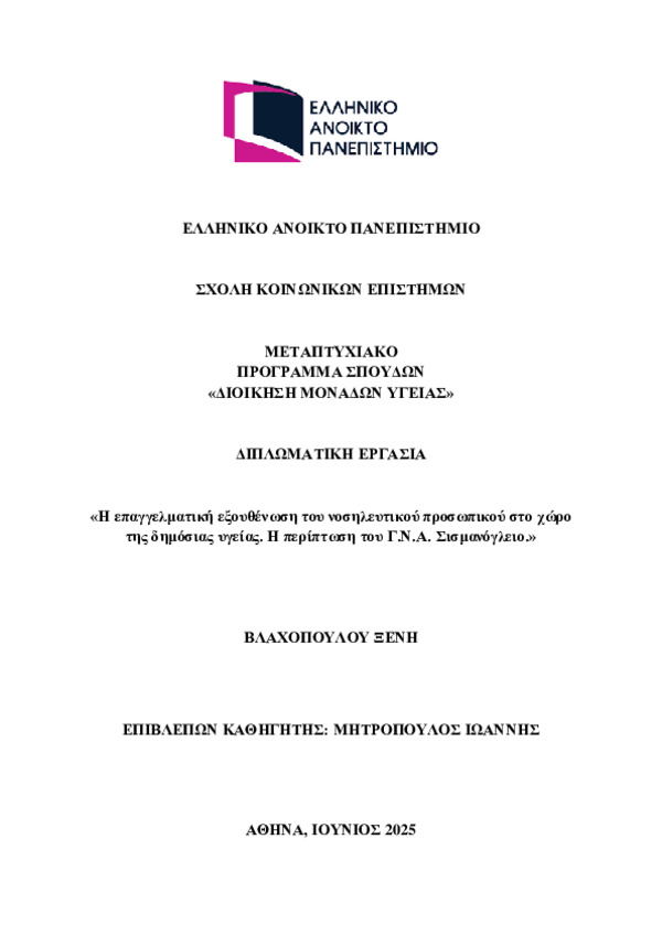 «Η επαγγελματική εξουθένωση του νοσηλευτικού προσωπικού στο χώρο της δημόσιας υγείας. Η περίπτωση του Γ.Ν.Α. Σισμανόγλειο.» Περιγραφή: Βλαχοπούλου Ξένη - Διπλωματική εργασία - ΑΜ 1483531!.pdf (pdf)