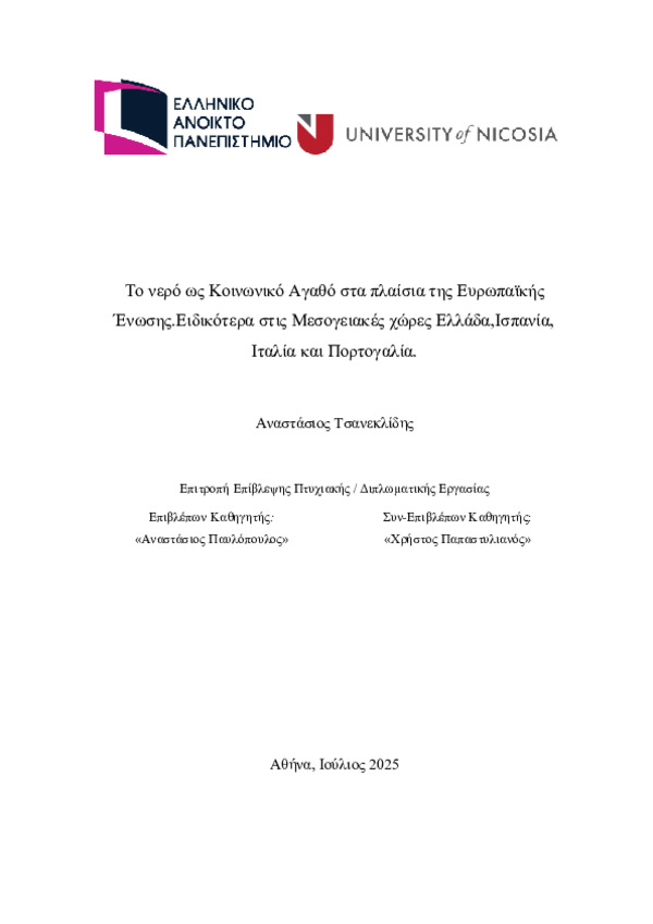 This specific Diploma thesis refers to water as a Social Good, within the framework of the European Union. In particular, in the Mediterranean countries, Greece, Spain, Italy and Portugal. The Diploma thesis is based on the study of Greek and international bibliography, the analytical and thorough study and the presentation of data and conclusions resulting from research within the framework of the European Union (EU) for the Mediterranean countries, analyzes the institutional framework that governs these countries, regarding water and water resources in general as well as the necessary guarantees that can establish and support the concept of water as a social good and less as a commercial one. It also describes the current situation in the Mediterranean countries referred to in the Diploma thesis and the legal frameworks that exist and are applied today. The jurisprudence of the European Court of Justice and of the National Courts is thoroughly examined, regarding the use and quality of water that the governments of the countries under study must implement. The Diplomatic Work is completed by drawing conclusions.