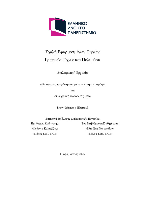 Το όνειρο - η σχέση του με τον κινηματογράφο & οι τεχνικές απόδοσης του - Ελένη Δέσποινα Πλατανιά Περιγραφή: 147151-ΠΛΑΤΑΝΙΑ ΕΛΕΝΗ ΔΕΣΠΟΙΝΑ.pdf (pdf)