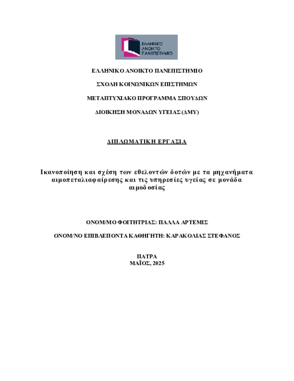 - Μηχανήματα αιμοπεταλιαφαίρεσης | Ικανοποίηση εθελοντών δοτών | ποιότητα υπηρεσιών υγείας | Ερωτηματολόγιο BDSQ | Αξιολόγηση υπηρεσιών αιμοδοσίας