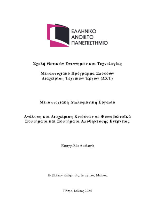 Περιγραφή: Ανάλυση και Διαχείριση Κινδύνων σε Φωτοβολταϊκά Συστήματα και Συστήματα Αποθήκευσης Ενέργειας_ΜΔΕ_ΔΙΑΛΥΝΑ ΕΥΑΓΓΕΛΙΑ.pdf (pdf) Book Reader