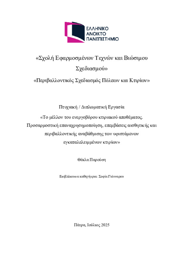 The future of energy-intensive building stock. Adaptive reuse, aesthetic and environmental upgrading of existing abandoned buildings (Αγγλική)