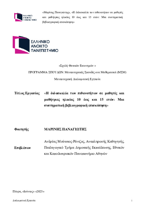 - Περιλαμβανει :ΕικόνεςΕικόνα 1:Διάγραμμα Prisma έρευνας 58 Εικόνα 2:Γράφημα κατανομής μελετών ανά ηλικιακή ομάδα 229 Εικόνα 3:Γράφημα εννοιών πιθανοτήτων 240 Κατάλογος Πινάκων Πίνακας 1:Σύνδεσης Παρανοήσεων και μαθηματικών εννοιών 25 Πίνακας 2: Δυσκολίες κατανόησης Πιθανοτήτων 26 Πίνακας 3: Αποτελεσματικές μέθοδοι 31 Πίνακας 5: Πίνακας αναφορών από PRISMA 60 Πίνακας 6:Ηλικιακής Κατανομής και Ερευνητικών Εστιών 225 Πίνακας 7;Κατανομή Μεθοδολογικών Προσεγγίσεων στις 40 μελέτες 232 Πίνακας 8:Συνοπτική παρουσίαση των εννοιών πιθανοτήτων 238 Πίνακας 9:Κατηγοριών Δυσκολίων και Αντίστοιχων Μελετών 244 Πίνακας 10 : Διδακτικών Προσεγγίσεων 252