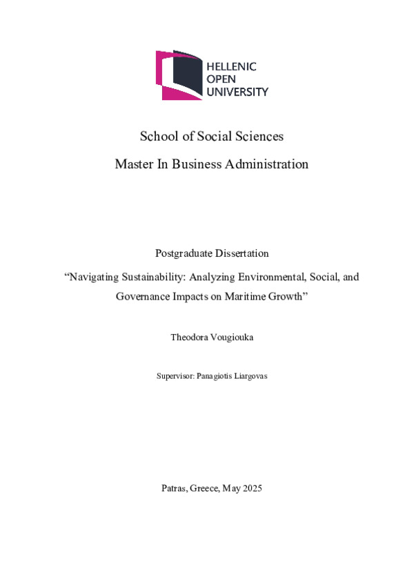 Η παρούσα εργασία εξετάζει τη σχέση μεταξύ οικονομικών, κοινωνικών και περιβαλλοντικών στόχων στη ναυτιλιακή βιομηχανία, με έμφαση στις πρακτικές βιωσιμότητας των ελληνικών ναυτιλιακών εταιρειών. Καθώς οι περιβαλλοντικές ρυθμίσεις γίνονται αυστηρότερες και οι προσδοκίες των ενδιαφερόμενων μερών αυξάνονται, τα πλαίσια Περιβαλλοντικής, Κοινωνικής και Εταιρικής Διακυβέρνησης (ESG) αποκτούν κεντρικό ρόλο στη στρατηγική λήψη αποφάσεων στον ναυτιλιακό τομέα. Χρησιμοποιώντας ποιοτική μεθοδολογία, η μελέτη αυτή αναλύει τις Εκθέσεις ESG και Βιωσιμότητας, καθώς και τις Ετήσιες Εκθέσεις, τεσσάρων κορυφαίων ελληνικών ναυτιλιακών εταιρειών, με σκοπό την αξιολόγηση του τρόπου ενσωμάτωσης των αρχών ESG στις λειτουργίες και τη διακυβέρνησή τους.