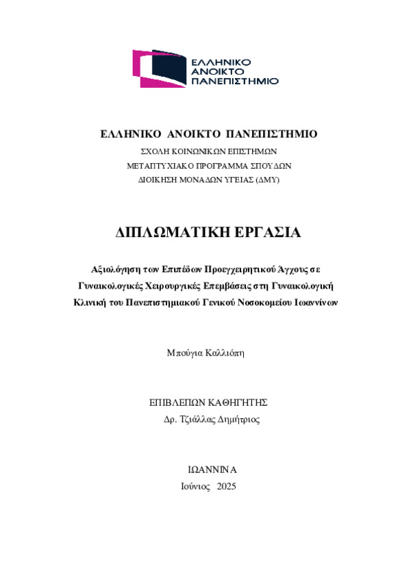 Αξιολόγηση των Επιπέδων Προεγχειρητικού Άγχους σε Γυναικολογικές Χειρουργικές Επεμβάσεις στη Γυναικολογική Κλινική του Πανεπιστημιακού Γενικού Νοσοκομείου Ιωαννίνων - Identifier: 229344