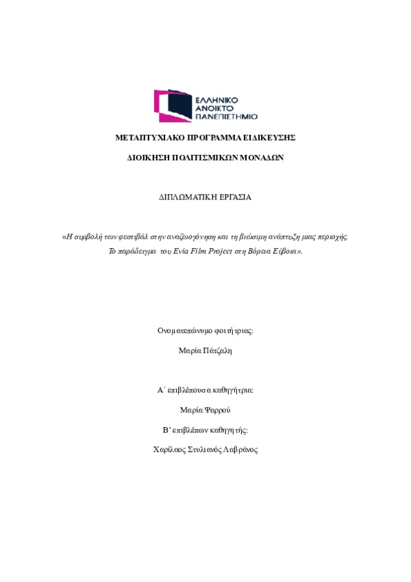 The contribution of artistic festivals to the revitalization and sustainable development of a place. The case of Evia Film Project in North Evia. (Αγγλική)