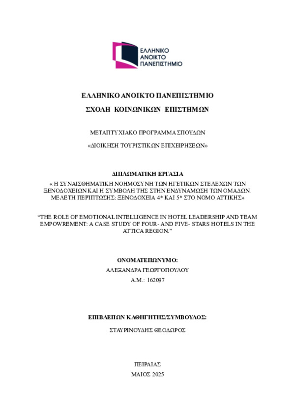 THE ROLE OF EMOTIONAL INTELLIGENCE IN HOTEL LEADERSHIP AND TEAM EMPOWREMENT: A CASE STUDY OF FOUR- AND FIVE- STARS HOTELS IN THE ATTICA REGION. (Αγγλική)