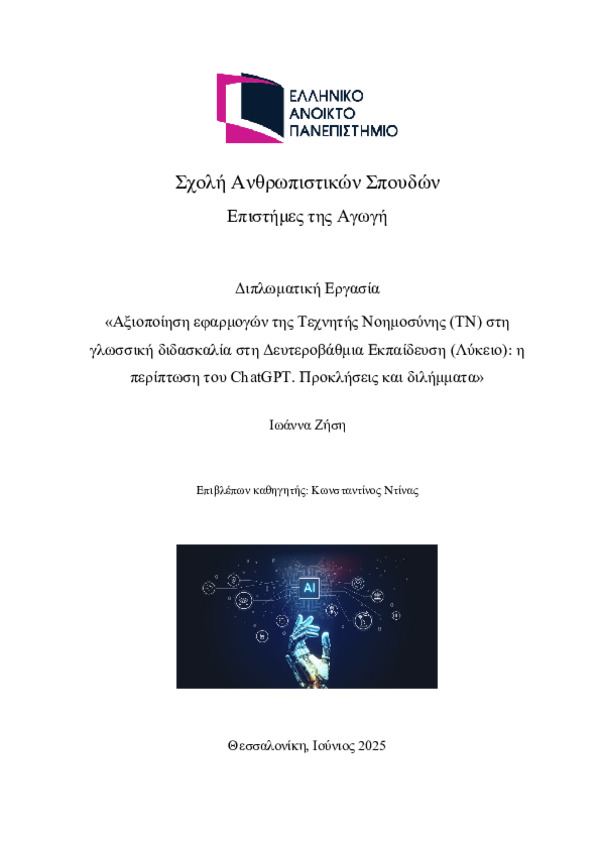 Το ChatGPT αποτελεί κορυφαίο επίτευγμα της Τεχνητής Νοημοσύνης. Πρόκειται για ένα εξελιγμένο μοντέλο επεξεργασίας φυσικής γλώσσας, το οποίο είναι ικανό να συνδιαλέγεται με τους χρήστες του σε πραγματικό χρόνο και φυσική γλώσσα, απαντώντας σε επαναλαμβανόμενες ερωτήσεις/προτροπές κειμένου ευρείας θεματικής ποικιλίας. Αυτά τα εξελιγμένα χαρακτηριστικά του ChatGPT προκαλούν ανάμικτα συναισθήματα στην εκπαιδευτική κοινότητα, από θαυμασμό μέχρι έντονη ανησυχία για το μέλλον της εκπαίδευσης που μετασχηματίζεται. Υπάρχουν πολλές θεωρητικές μελέτες που παρουσιάζουν τα πλεονεκτήματα του ChatGPT και εφιστούν την προσοχή στις αδυναμίες και τους περιορισμούς του. Λείπουν όμως οι εμπειρικές μελέτες, ώστε να διερευνηθούν επαρκώς στην πράξη οι θεωρητικές αυτές προσεγγίσεις.