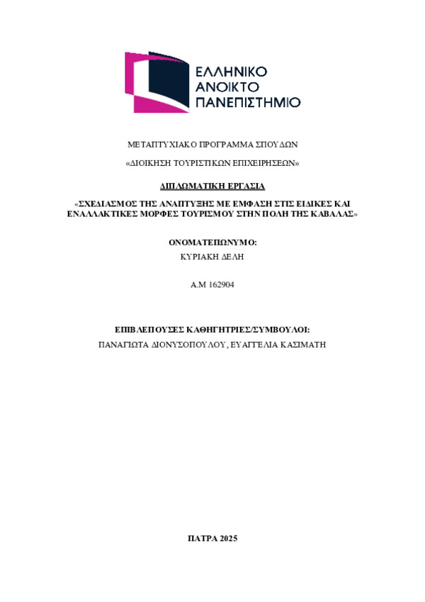 This undergraduate thesis constitutes an extensive analysis of prospects for developing distinctive and innovative tourist modalities for the Greek prefecture of Kavala, using an integrated methodology that incorporates quantitative and qualitative research methods. With its high historical, natural, and cultural heritage, Kavala stands ideally positioned to substantially assist Greek tourism in shifting toward sustainable, diversified, and competitive forms of development, hence moving out of the mass tourist paradigm that has remained dominant in recent decades.