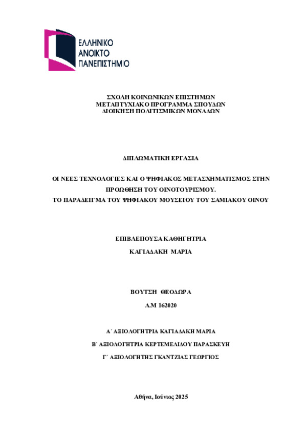 Οι Νέες Τεχνολογίες και ο Ψηφιακός Μετασχηματισμός στην Προώθηση του Οινοτουρισμού. Το Παράδειγμα του Ψηφιακού Μουσείου του Σαμιακού Οίνου - Identifier: 229503