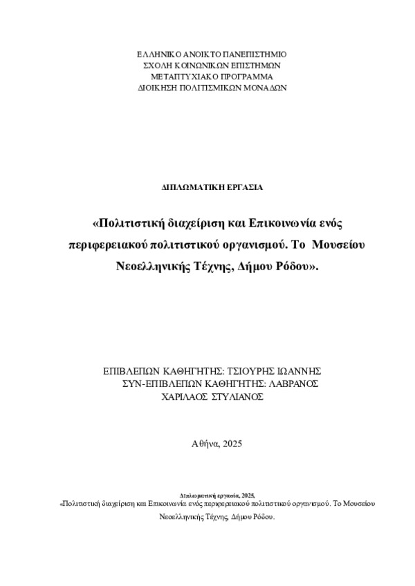 This thesis seeks to highlight key elements of the operation of the Museum of Modern Greek Art of the Municipality of Rhodes, related to its role as a modern museum institution through policy communication, actions and events, and the effort to strengthen its digital footprint. The theoretical documentation of parameters concerning the operation of the modern museum and related to issues of strategic management and communication, as well as its relationship with digital technology, as part of its role in the 21st century, was assessed. Furthermore, it was deemed a comparative approach with other museum institutions and to present proposals for the adoption of good practices.