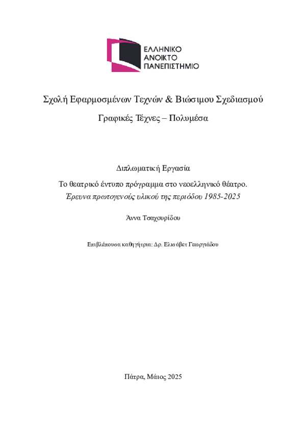 The Greek theatrical program (playbill), the printed material accompanying a theatrical performance, shares a parallel historical trajectory with Modern Greek theatre itself. This postgraduate thesis examines the theatrical program through the interdisciplinary lenses of Greek print history, graphic design, and visual communication, with an emphasis on its artistic value and its relation to the cultural context of each period. The research begins by defining the program’s formal, functional, and content-based characteristics and investigates its origins in the Western world―specifically in Europe, with a focus on British theatre, and in the United States, centering on Broadway. The literature review is supported by visual documentation of playbills from these regions and periods. The thesis then traces the evolution of the Greek theatrical program from the mid-19th-century single-sheet format to the multi-page programs of the mid-1980s. Drawing on bibliographic sources and digital theatrical archives, the study examines how the structure, content, and aesthetics of programs transformed over time, reflecting key stages in the history of Modern Greek theatre and corresponding sociopolitical developments in Greek history. The main research segment focuses on the period 1985–2025, based on an analysis of an extensive sample of primary materials from the Laboratory for Research and Documentation of Modern Greek Theatre (EETNTH) at the Department of Theatre Studies of the National and Kapodistrian University of Athens (NKUA), as well as from private collections. Through sampling, representativeness checks, and categorization, the study identifies the formal and thematic characteristics of programs from this period, accompanied by visual documentation. The thesis concludes by presenting key findings and proposing a preliminary typology of Greek theatrical programs. It also discusses the limitations encountered during the research and identifies new directions for future academic inquiry.