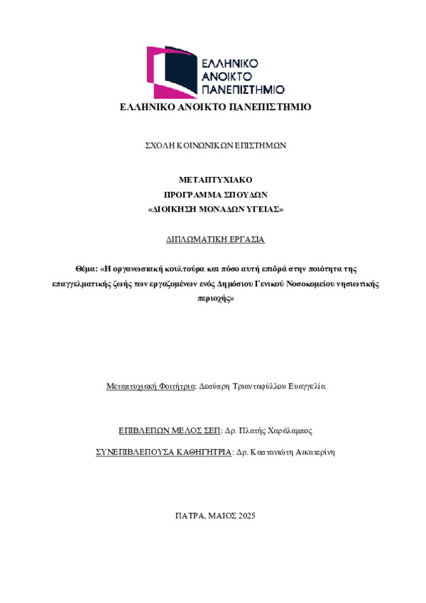 Η οργανωσιακή κουλτούρα και πόσο αυτή επιδρά στην ποιότητα της επαγγελματικής ζωής των εργαζομένων ενός Δημόσιου Γενικού Νοσοκομείου νησιωτικής περιοχής - Identifier: 229590