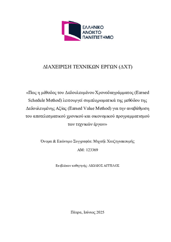 Η παρούσα διπλωματική εργασία εξετάζει τη συμπληρωματική σχέση μεταξύ της μεθόδου του Δεδουλευμένου Χρονοδιαγράμματος (Earned Schedule Method - ESM) και της μεθόδου της Δεδουλευμένης Αξίας (Earned Value Method - EVM), με σκοπό τη βελτίωση της ακρίβειας στον χρονικό και οικονομικό προγραμματισμό τεχνικών έργων. Ειδικότερα, αναδεικνύεται πώς η ESM μπορεί να καλύψει τις αδυναμίες της EVM στην πρόβλεψη του χρόνου ολοκλήρωσης.