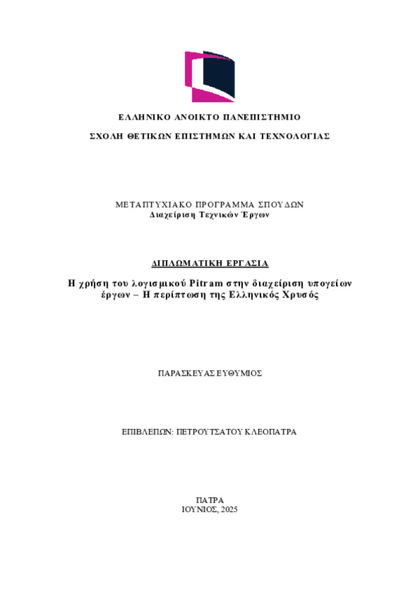 project management software, as well as its implementation and use in an active, realworld project: the underground exploitation of polymetallic sulfide ore deposits by the company Hellas Gold in the Olympias area.