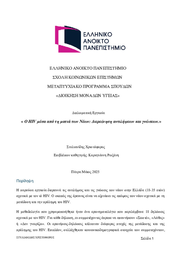 Η παρούσα εργασία διερευνά τις αντιλήψεις και τις γνώσεις των νέων στην Ελλάδα (18-35 ετών) σχετικά με τον ιό HIV. Ο σκοπός της έρευνας είναι να εξετάσει τις απόψεις των νέων σχετικά με τη μετάδοση και την πρόληψη του HIV. Η μεθοδολογία που χρησιμοποιήθηκε ήταν ένα ερωτηματολόγιο που περιλάμβανε 18 δηλώσεις σχετικά με τον HIV. Για κάθε δήλωση, οι συμμετέχοντες έπρεπε να απαντήσουν «Σωστό», «Λάθος»